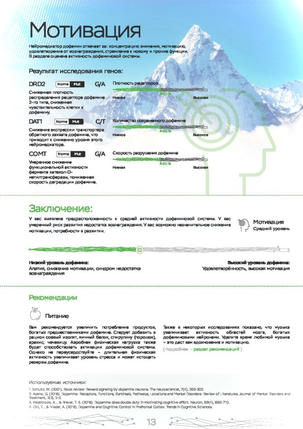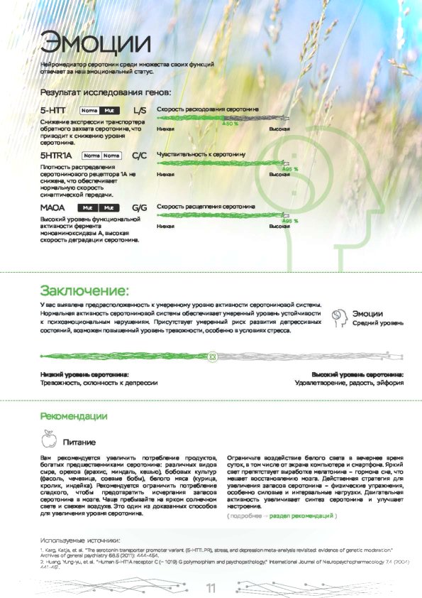 Этот ДНК анализ показывает влияние наиболее важных 10 генов на психическое и эмоциональное состояние. Именно они регулируют выработку гормонов, работу нейромедиаторов. Используйте знания о природных свойствах своего организма для борьбы со стрессом, повышения работоспособности и общего тонуса. Каждый человек индивидуален, поэтому мы рекомендуем пройти наш генетический нейро тест в Суворове.